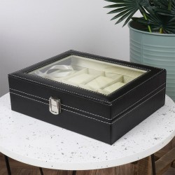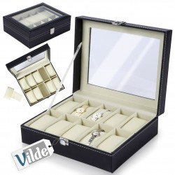 Klaaspaneeliga käekella või ehete hoiukarp. Karp on äärmiselt elegantne, nii et see saab ainulaadseks kaunistuseks elutuppa, magamistuppa või garderoobi. Ideaalne neile, kes hindavad korrasolekut ja korda. See näeb muljetavaldav välja kummutil, öökapil või tualettlaual. Karp kaitseb mustuse ja kahjustuste eest ning võimaldab kellasid või ehteid korralikult hoiustada. Huvitav kingiidee nii naistele kui meestele. Vilde kaubamärgi originaaltoode. Toodetud vastavalt Euroopa standarditele.