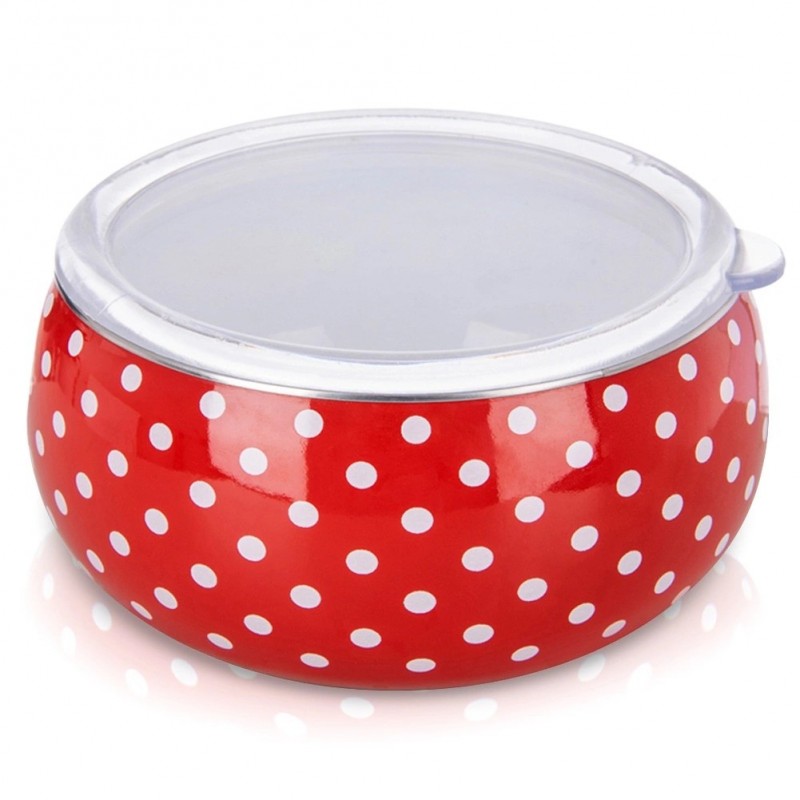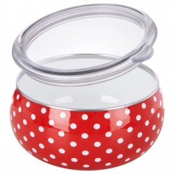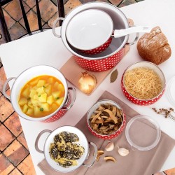 - Valmistatud emailitud terasest – valmistatud kõrgeima kvaliteediga punase emailiga terasest. Sellel on muljetavaldav kaunistus, mille pinnal on valged täpid. Kausi sisemus on valge. Kausi äär on valmistatud hõbedasest roostevabast terasest. Läbipaistvast materjalist kaas. Nõusid kattev email on tervisesõbralik materjal ja isegi allergikutele ohutu.