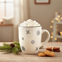 - Keraamikast – kruus on valmistatud kvaliteetsest valgest keraamikast. Sellel on lumehelbe motiiviga värviline muster. Lisaaktsent on ülemise serva must äär, mis toob kaunilt esile kruusi piduliku iseloomu.