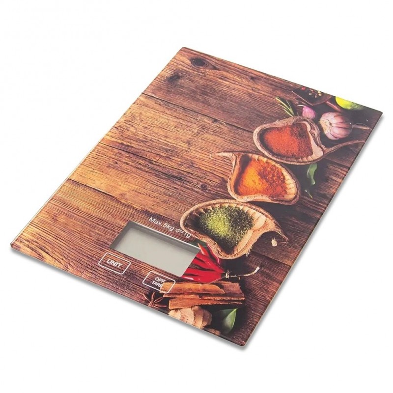 - Valmistatud karastatud klaasist – kaal on valmistatud karastatud klaasist ja kvaliteetsest plastikust. Selle pealispinnal on pilkupüüdev köögikaunistus, mis kujutab vürtse.