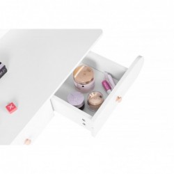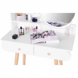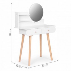 Suur ja moodne peegli ja riiulitega kosmeetiline tualettlaud on ideaalne valik inimestele, kes hindavad mugavust ja modernset disaini. Tualettlaud on varustatud praktilise ümmarguse peegliga, mille mõõtmed on 40x40 cm, mis tagab mugavuse igapäevase meigi pealekandmise ajal. Kaks suurt väljatõmmatavat sahtlit ja lisariiulid pakuvad palju ruumi kõigi vajalike aksessuaaride ja kosmeetika hoidmiseks. Suur tööpinna pind võimaldab meigi vaba pealekandmist. Tualettlaua ohutu ja stabiilne konstruktsioon on valmistatud puidust, puitlaastplaadist ja spoonist, mis tagab vastupidavuse ja kahjustustekindluse.