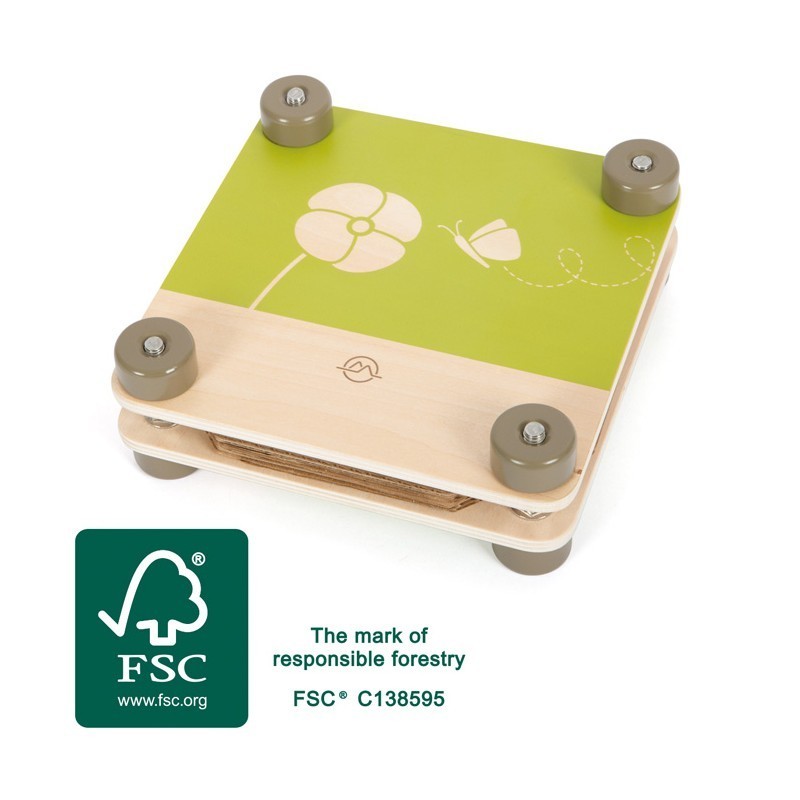 Vajutage lilli kiiruga! Sellel tugevast FSC® sertifikaadiga puidust valmistatud lastesõbralikul lillepressil on neli jalga ning 8 papilehte ja 16 presslehte. Sellega pakub see palju ruumi lehtede, õie kroonlehtede ja lillede kuivatamiseks ja tasandamiseks. Pannes kogutud loodusvarad lihtsalt paberi- ja papikihtide vahele, saad neid lihtsalt säilitada. Puidust rõngastesse asetatud neli metallkruvi ja mutrit muudavad selle kasutamise lastele lihtsaks, kuna neil on tugev haare ja piisavalt tugevust, et kaks puitpaneeli kokku suruda. See puidust lillepress jätab suurepärase visuaalse mulje oma ümarate servade, kvaliteetse valmistamise ja atraktiivse disainiga, milles on palju nähtavat puitmaterjali kombineerituna moodsate roheliste värvidega.