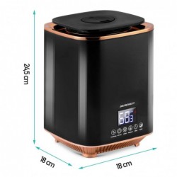 Berdsen Premium õhuniisutaja. Kaasaegne õhuniisutaja ionisatsiooni- ja aromatiseerimisfunktsiooniga - suure niisutusvõimsusega kuni 250 ml/h! Peamised omadused: niisutamine, ionisatsioon, aroomiteraapia, udu, suur veepaak - 2,6 l, hügrostaat vahemikus 45–90%, sisseehitatud hügromeeter - niisutaja kontrollib ümbritseva õhu niiskust, kaasaegne disain, kõrge efektiivsus kuni 9 tundi tööd ühe paagiga, automaatne väljalülitus pärast veepaagi tühjenemist, sisseehitatud taimer (vahemikus 1–9 tundi tööd), puutetundlik juhtpaneel, veefilter - katlakivi eemaldamine (sisseehitatud). Tervislik õhk teie ümber Tihti ei pööra me tähelepanu oma ümbruse õhu niiskusele, kuid eriti kütteperioodil võib liiga kuiv õhk põhjustada ebamugavust ja halba enesetunnet – limaskestade kuivamist, bakterite ja viiruste hõljumist (allergiad ja infektsioonid), epidermise kuivamist (nahaprobleemid). Berdseni õhuniisutajaga saate: endale ja oma perele parema une, tugevdate oma jumet, parandate üldist heaolu, väldite paljusid nakkusi ja allergiaid, parandate oma taimede seisundit. Nutikas niisutamine Ei mingit liigset auru ega liigset energiatarbimist Sisseehitatud hügrostaat Saate seadistada soovitud niiskuse vahemikus 45% kuni 90%. Niisutaja jätkab tööd, kuni keskkonnas on saavutatud soovitud niiskustase. Sisseehitatud hügromeeter Kui soovitud õhuniiskus on saavutatud, lülitub niisutaja ooterežiimile, kontrollides pidevalt õhuniiskuse taset. Kui õhuniiskus langeb alla oodatava väärtuse, jätkab niisutaja automaatselt tööd. Aroomiteraapia – tervis ja lõõgastus ühes, sukeldu värskendavatesse lõhnanootidesse. Niisutaja võimaldab teil peale kanda lõhnastatud õli, mille lõhn püsib niisutaja kasutamise ajal. Vala 2-3 tilka veepaaki. Õhu ionisatsioon – hinga sügavalt sisse. Ionisatsioon võimaldab neutraliseerida positiivseid ioone, mis kannavad endas viiruseid, baktereid ja tolmu. Ioniseeritud õhk on inimkehale tervislikum, tuues leevendust eriti hingamisteede haiguste korral. Öörežiim – hea une saamiseks vajutage vaid ühte nuppu, et lülitada õhuniisutaja unerežiimi, mis lülitab ekraani välja ja jätkab niisutamist märkamatult. Maga rahulikult ja lase niisutajal oma tööd teha. Intuitiivne LED-puutepaneel Ioniseerimine Niisutaja sisse-/väljalülitamine Niisutamise kiiruse/intensiivsuse reguleerimine (3 töörežiimi) / öörežiimile lülitamine Niisutaja soovitud niiskustaseme seadistamine (45 kuni 90%) Taimer - ajastatud väljalülituse seadistamine Unerežiim, unerežiimis saab infopaneeli aktiveerida või tuhmistada 3-ühes niisutaja - kolm niisutusrežiimi - niisutusintensiivsuse saab vabalt valida vahemikus 45–90%. Tehnilised andmed: tüüp: ultraheli õhuionisatsiooni funktsioon aroomiteraapia funktsioon külm udu kõrge efektiivsus: 250 ml/h automaatne väljalülitus puutetundlik LED-paneel sisseehitatud hügrostaat ja hügromeeter suur veepaak: 2,6 l katlakivi eemaldamise filter (Maifan kivi) madal müratase toide: vooluvõrk 220 - 240 V, kaabli pikkus: 1,25 m. Kaugjuhtimispult kaasas (patareid on kaasas). Tähelepanu! Vesi tuleks valada sobivasse kohta vastavalt juhistele.