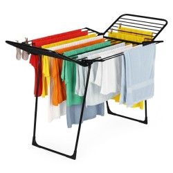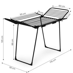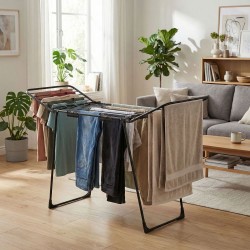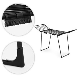 Kuivati kuivatusala on 25 ruutmeetrit, mis võimaldab teil mugavalt riputada üles isegi suuremaid pesukoguseid. Vastupidavast pulbervärvitud terasest valmistatud kuivati on väga stabiilne ja vastupidav igapäevasele kasutamisele – nii sise- kui ka välistingimustes. Kokkupandav disain võimaldab hõlpsat hoiustamist isegi kitsastes ruumides. Integreeritud konksud võimaldavad teil sokke ja aluspesu kuivatada ilma pesulõksudeta. Libisemisvastased jalaotsad suurendavad stabiilsust, hoides ära juhusliku liikumise. Kiire voltimissüsteem ja tiiblukud lihtsustavad igapäevast kasutamist ja hoiustamist kokkupanduna. Kokkupandavad tiivad suurendavad oluliselt kuivatusala – ideaalne suuremate pesukoguste jaoks. Kokkupanmismehhanism töötab sujuvalt ja stabiilselt, tagades kasutusmugavuse ja pikaajalise kasutamise ilma kinnikiilumise ohuta. Maksimaalne pesukogus: kuni 20 kg.