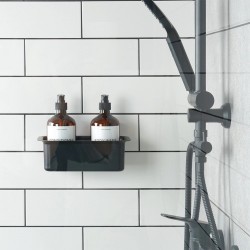 - Täiendav hoiuruum – riiulil saab hoida erinevaid hooldustooteid ja tarvikuid, nagu dušigeel, šampoon, kosmeetika, švammid või pintslid. Selle põhjas on väikesed augud, mis takistavad vee kogunemist. Seda saab kasutada ka köögis maitseainete riiulina.