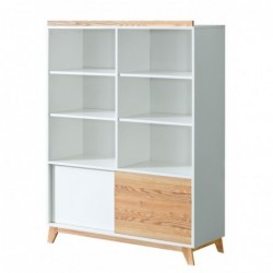 Raamatukapp Nordiku kapi ja kuue riiuliga. Kapp raamatute, õppemängude või muude laste mänguasjade jaoks. Kasulik vaikse ja mugava töö- või lugemisnurga loomiseks elutuppa. Rahulikes, harmoonilistes toonides mööbliese, naturaalne saar kombineeritud valge värviga. Sellel on kinnine lükandustega kapp, mille sees on meil üks riiul, mis teeb korra hoidmise lihtsamaks. Uste puudumine kõrgematel riiulitel annab väikelastele võimaluse oma lemmikmänguasjadele hõlpsasti juurde pääseda. Seevastu laps saab oma pisiasju lihtsalt oma maitse järgi sättida, õppides samal ajal korda hoidma.