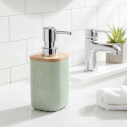 - Praktiline dosaator seebi või nõudepesuvahendi jaoks – mahuti vedelseebi või nõudepesuvahendi dosaatoriga. Anuma mõõdud on 9,5 x 7,5 x 17,5 cm. Mahuti maht on 350 ml. Rohekas seeria konteiner.