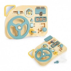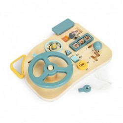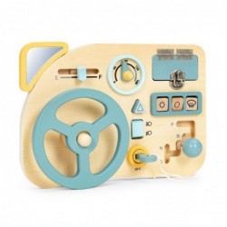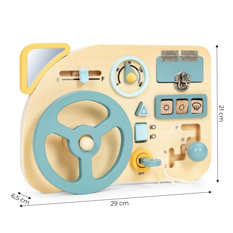 Tahvel on valmistatud puidust, ilma teravate servadeta ja sisaldab palju huvitavaid autoga seotud elemente, nagu rool, turvapeegel, raadio, käigukang, riiv, süütelüliti koos võtmega, tulede lüliti , kliimaseade ja ohutulede nupp.