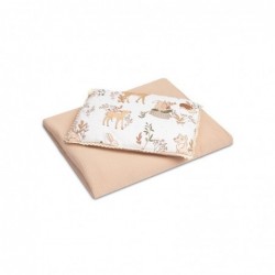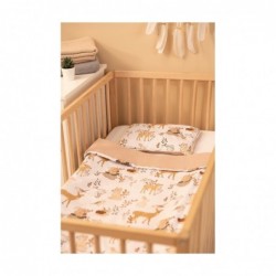 Armsa metsloomade disainiga teki ja padja komplekt. Kangas on üheltpoolt kõrgekvaliteedilisest musliinist ja teiselt poolt trükitud puuvillast, seega on lapse naha suhtes õrn ja tagab turvalise ja mugava magamiskeskkonna. Pehme padi on kaunistatud pitsist äärega. Komplekti õhku läbilaskev musliinikangas tagab piisava õhuringluse. Kogu komplekti mõõtmed on kohandatud nii, et see sobiks ideaalselt beebivoodisse või hälli ja nii on laps kogu öö jooksul kaetud.