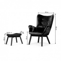 Jalatoega tiibtool Kood: 2047 Must jalatoega tiibtool Lõõgastus parimas stiilis! Populaarne kõrvaklapp erakordselt šikis versioonis. See sobib ideaalselt nii elegantsesse Skandinaavia esteetikaga elutuppa kui ka hubasesse magamistuppa. Elegantne jalatugi Jalatugi võimaldab teil pärast väsitavat päeva mugavalt jalgu sirutada. Iga tooliga on kaasas TASUTA padi! Tugitooliga on kaasas stiilne padi, millel on eemaldatav kate. Põrandakaitsepolster Tugitooli ja jalapingi pöögist jalad on polsterdatud vildiga, et kaitsta põrandat kriimustuste eest. Stiilne igas detailis Tehnilised andmed: Värvus: must Materjal: samet Polsterdusmaterjali kaal: 220 g/m² Jala materjal: pöök Komplekti sisu: tugitool, jalatugi, TASUTA padi Tugitooli kaal: 12 kg tugitool + 4 kg jalatugi (stabiilne ja mugav)
