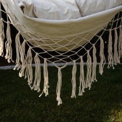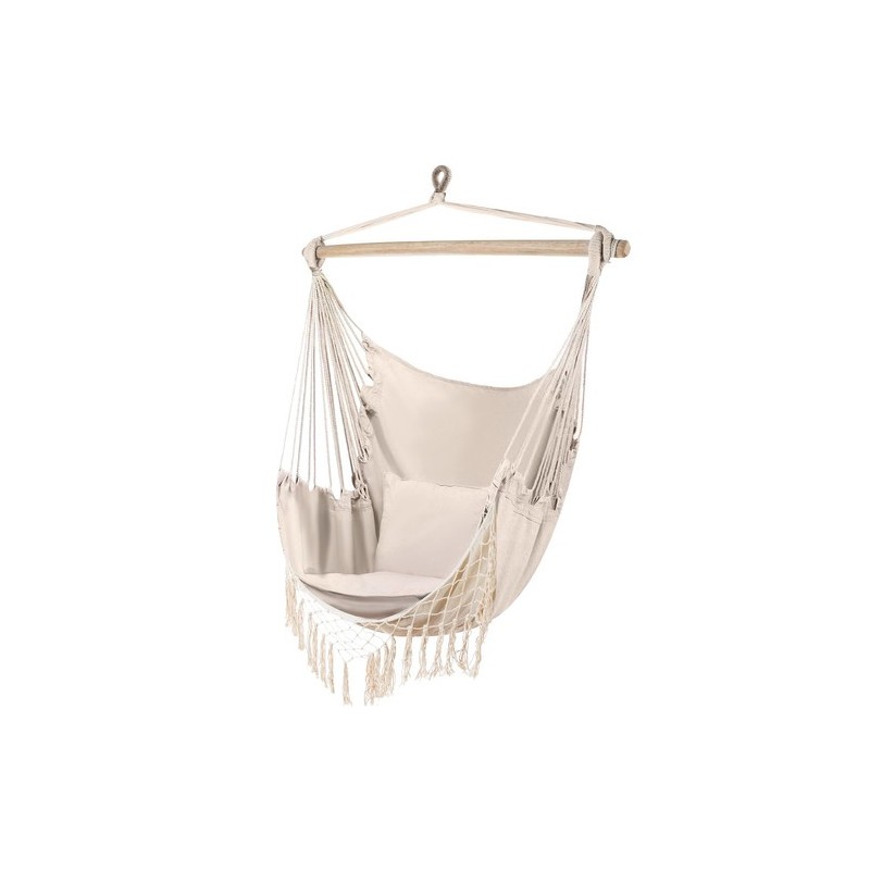 VASTUPIDAV MATERJAL - puuvill tagab korraliku ventilatsiooni, mis suurendab ripptooli kasutamise mugavust ka kuumadel päevadel. Polüestri segu vastutab istme vastupidavuse eest. Tugev montaažirõngas on ühendatud vastupidavate trossidega, mis jaotatakse võrkkiige külgedele ühtlaselt läbi puidust risttala. See disain muudab selle riputamise lihtsaks ning võrkkiik on hästi tasakaalustatud ja stabiilne.