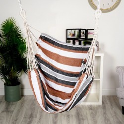 - Lihtne kokkupanek – tugitool on riputatud kahe tugeva aasadega köiega, kinnitage see lihtsalt kahe konksu või stabiilse aiakonstruktsiooni külge. See on kinnitatud kahest kohast vastupidavate nööride külge.
